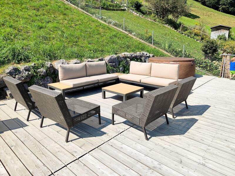 Unser Chalet bietet Ihnen alles, was Sie für einen erholsamen Aufenthalt benötigen: Im Wellnessbereich erwartet Sie eine Whirlwanne für zwei Personen und eine Sauna, ideal zum Entspannen und Abschalten. Auf der großzügigen Terrasse finden Sie einen Grill, eine gemütliche Lounge, einen Esstisch sowie einen Softub-Whirlpool, der zum Verweilen einlädt.